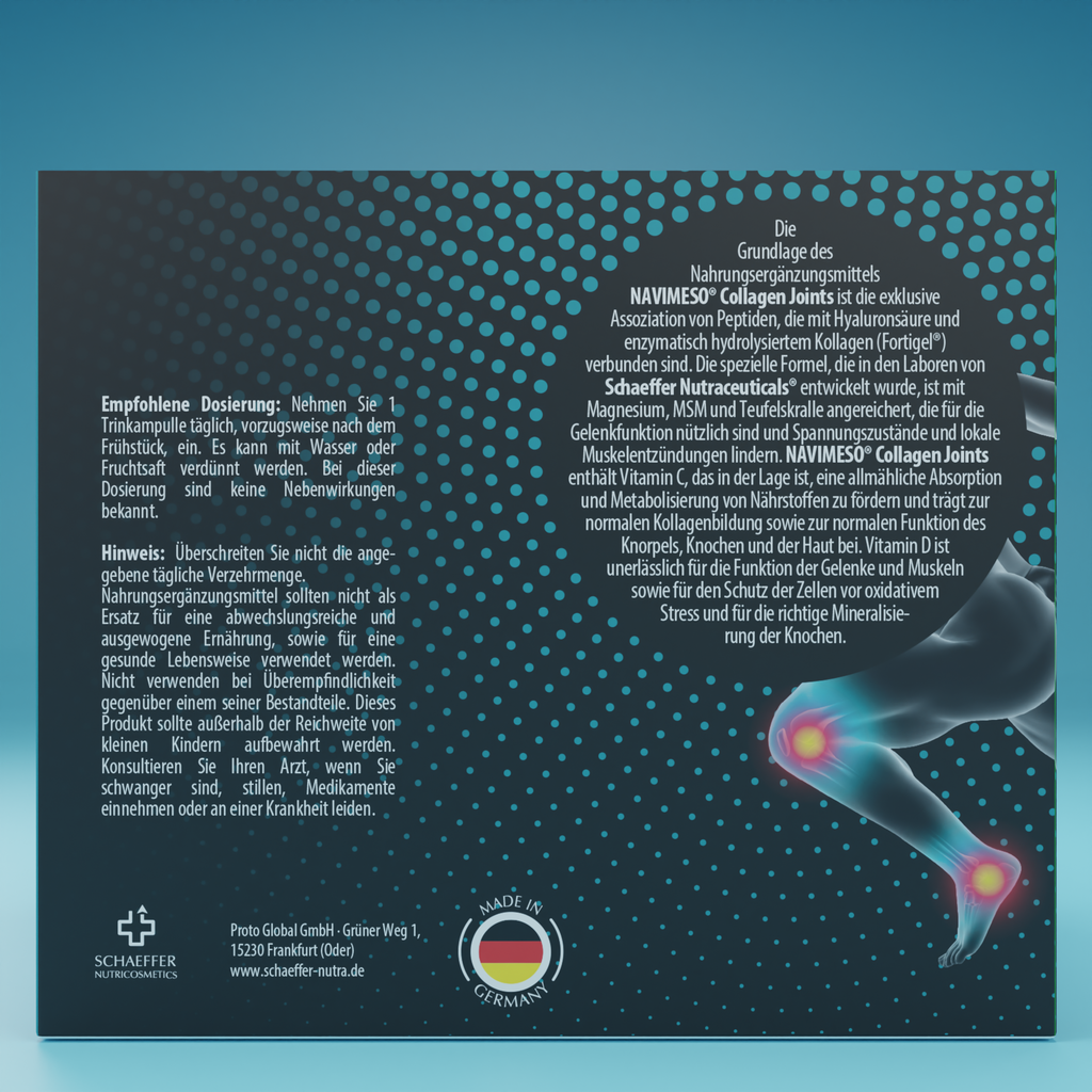 Willkommen in der Zukunft der wohltuenden Ernährung für die gesundheitliche Förderung der Gelenke mit NAVIMESO® Collagen Joints. Unser fortschrittliches, trinkbares Kollagenpräparat wurde von Schaeffer Nutraceuticals® sorgfältig entwickelt, um Ihnen eine umfassende Unterstützung für Ihre Gelenk- und Muskelgesundheit zu bieten.