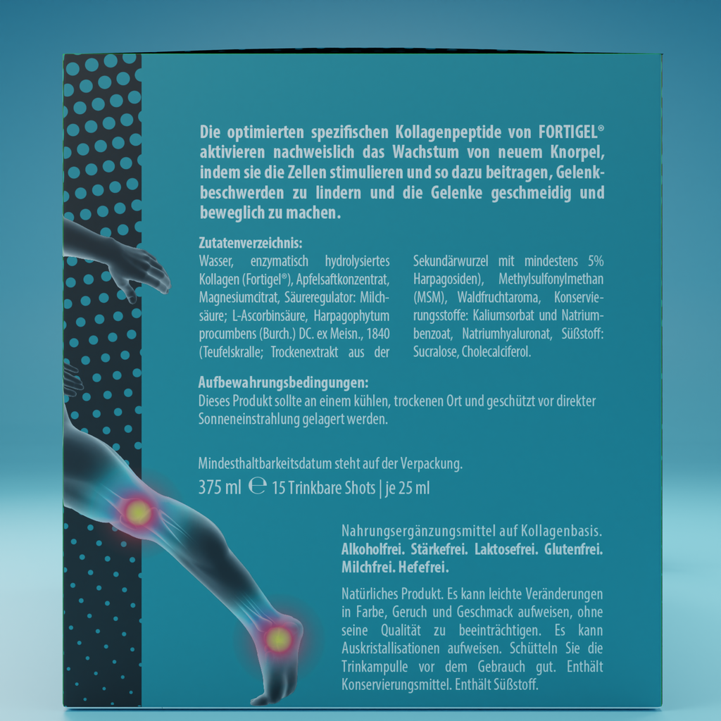 - Wasser, enzymatisch hydrolysiertes Kollagen (Fortigel®), Apfelsaftkonzentrat, Magnesiumcitrat, Säureregulator: Milch-säure; L-Ascorbinsäure, Harpagophytum procumbens (Burch.) DC. ex Meisn., 1840 (Teufelskralle; Trockenextrakt aus der Sekundärwurzel mit mindestens 5% Harpagosiden), Methylsulfonylmethan (MSM), Waldfruchtaroma, Konservierungsstoffe: Kaliumsorbat und Natriumbenzoat, Natriumhyaluronat, Süßstoff: Sucralose, Cholecalciferol.
