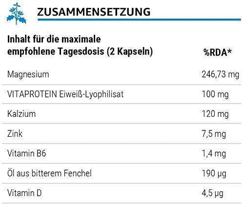 - Magnesium oxide, protein lyophilisate (from hen's egg), calcium carbonate, magnesium carbonate, zinc oxide, pyridoxine hydrochloride, cholecalciferol, bitter fennel oil (Foeniculum vulgare), gelatin