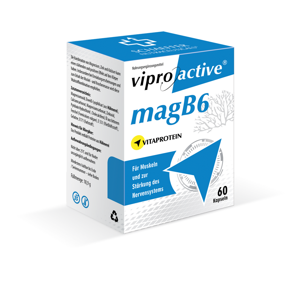 Viproactive MagB6 is a dietary supplement for people with magnesium deficiency. Schaeffer Nutraceuticals has developed a balanced combination of magnesium, zinc and calcium to support the nervous system and muscle function. Many people suffer from insufficient magnesium, a mineral that can cause a number of problems when critically deficient. Schaeffer Nutraceuticals has developed a formula that, when taken regularly, ensures a healthy level of magnesium in your body.