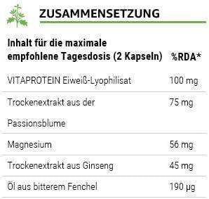 Protein lyophilisate (from hen's egg), dry extract of hop cones (Humulus lupulus L.), dry extract of passion flower (Passiflora caerulea L.), magnesium salt citric acid, dry extract of ginseng (Panax Ginseng CA), bitter fennel oil (Foeniculum vulgare), gelatin