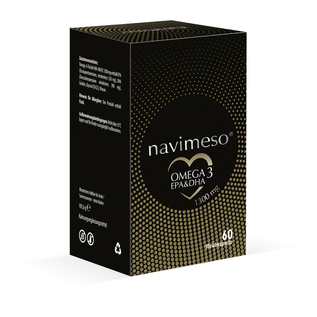 Willkommen in der Zukunft von ganzheitlicher Gesundheit und Wohlbefinden mit NAVIMESO® Omega, Ihrem täglichen Begleiter für ein starkes Herz, scharfen Verstand und gesunde Gelenke. Erleben Sie die geballte Wirkung von Omega-3-Fettsäuren, die sorgfältig mit EPA und DHA aus hochwertigem Fischöl formuliert wurden, um Ihr Wohlbefinden auf ein neues Niveau zu heben.