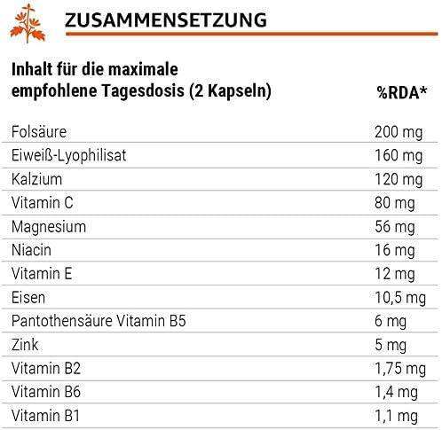 - Eiweiß-Lyophilisat (aus Hühnerei), Folsäure, Kalzium, Vitamin C, Magnesium, Niacin, Vitamin E, Eisen,Pantothensäure, Zink, Vitamin B2, Vitamin B6, Vitamin B1, Mangan, Kupfer, Vitamin A, Vitamin K, Jod, Biotin, Molybdän, Selen, Chrom, Vitamin D3, Vitamin B12, Öl aus bitterem Fenchel (Foeniculum vulgare), Gelatine