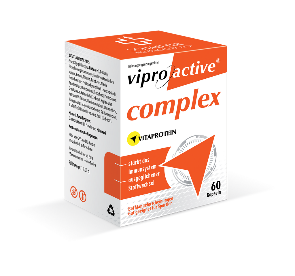 Viproactive Complex ist der perfekte Multivitamin-Komplex. Er kombiniert eine Fülle von Vitaminen und Mineralstoffen mit dem Vitaprotein-Träger, der die Nährstoffversorgung der Zellen optimiert, sodass der Körper die maximale Energie erzeugen kann. Es ist ein Nahrungsergänzungsmittel, das Schaeffer Nutraceuticals für diejenigen entwickelt hat, die sich einen reibungslos funktionierenden Stoffwechsel wünschen und gesundheitliche Probleme vermeiden möchten, welche durch einen Mangel an Vitaminen, Mineralstoffen und Aminosäuren verursacht werden.